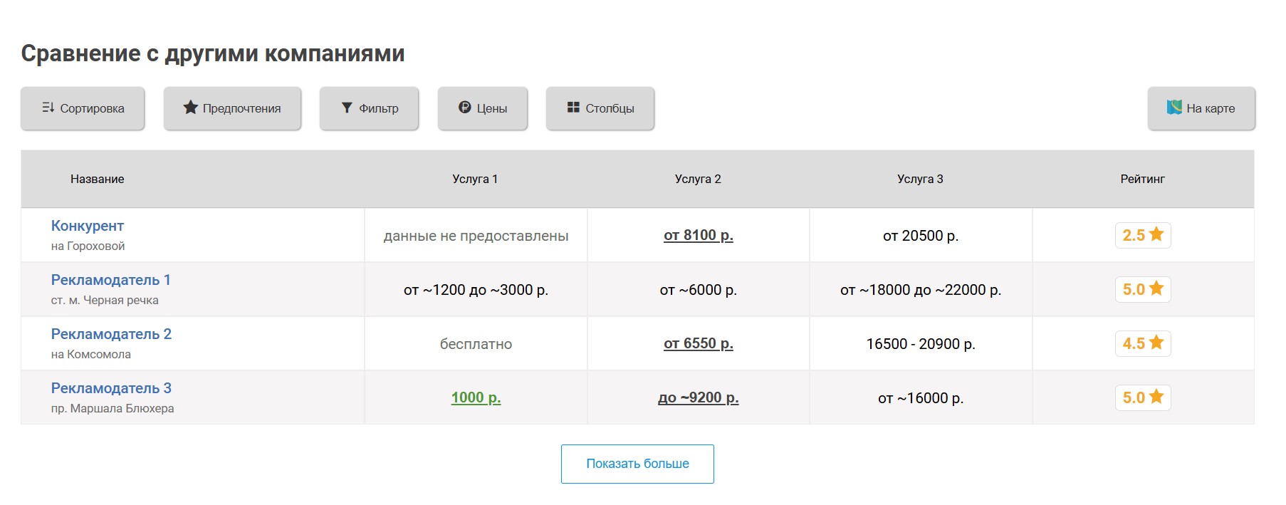 ателье, продвигаемое ателье попадёт к ним в таблицу «Сравнение по ценам», которая выглядит следующим образом: